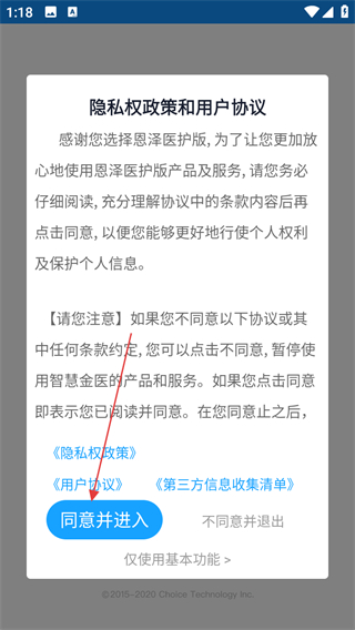 1、打开恩泽医护版APP,在隐私权政策和用户协议页面,点击同意并进入。