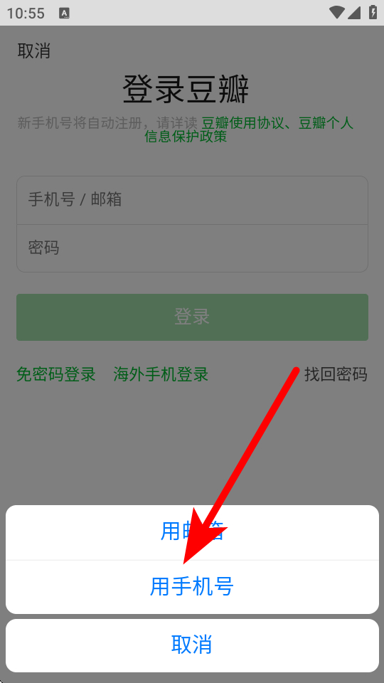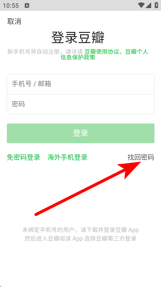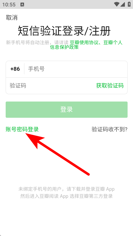 1、在豆瓣阅读登录页面,点击账号密码登录选项,进入账号密码登录界面。