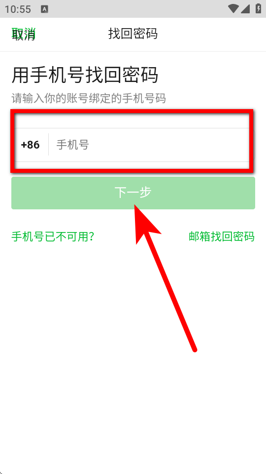 3、在找回方式选择列表中,点击用手机号选项,进入用手机号找回密码页面。