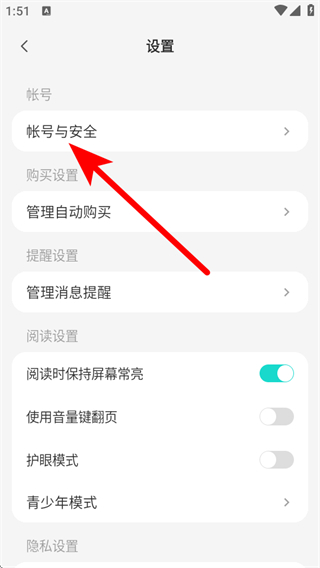 2、在设置界面,点击帐号与安全选项,进入资料与账号安全页面。