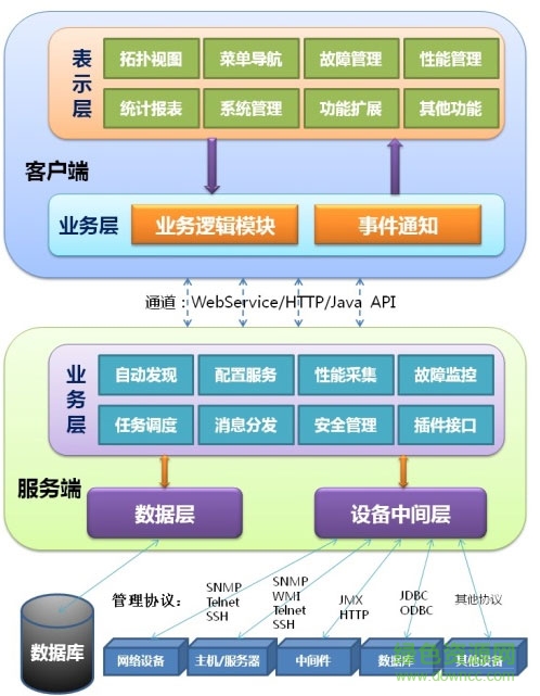 开发平台的基础框架遵循多层架构模式:表示层、业务层、数据层、和设备中间层。其中表示层负责客户端显示,业务层由业务逻辑、功能逻辑组成,数据层主要由数据库和数据访问服务实现,设备中间层作为系统与各种被管设备的通讯协议层。层次性的设计增加了系统的灵活性、可扩展性