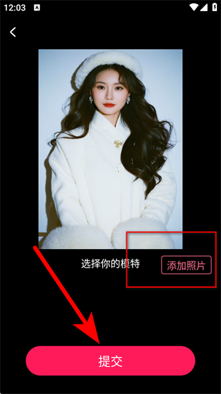 3、进入模板页面后,点击添加照片按钮,选择需要制作写真的照片后点击提交。