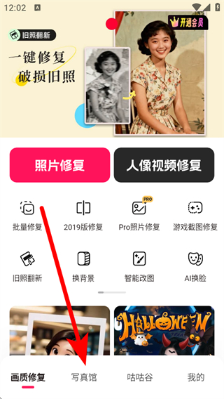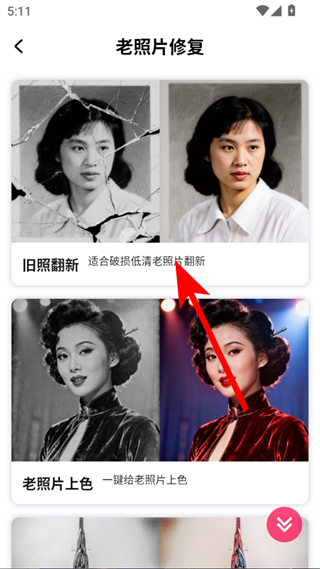 1、打开APP后,点击老照片修复选项,进入老照片修复功能页面。