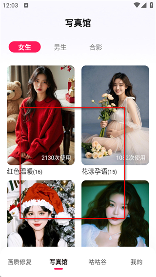 2、在写真馆页面选择喜欢的写真模板,如红色温暖等。