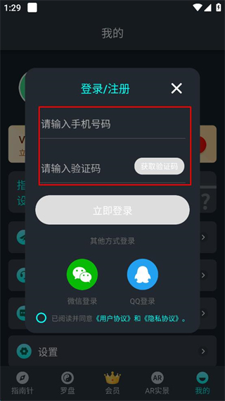 3、输入手机号码,获取并输入验证码,勾选同意用户协议和隐私协议。