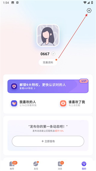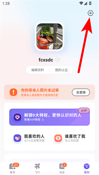 2、在个人页面点击右上角设置图标,进入设置功能列表页面。