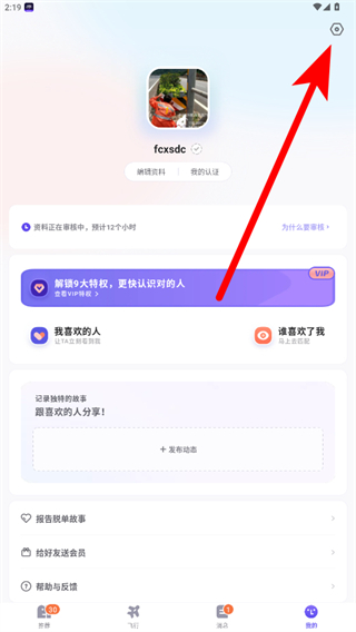 2.在个人中心界面,点击右上角的设置图标。