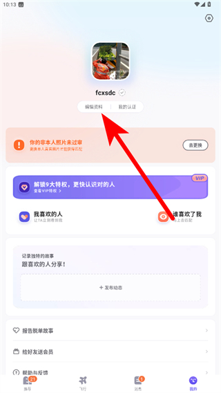 2、在个人页面中,点击昵称上方的编辑资料按钮。
