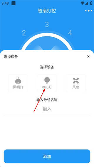 2、在弹窗中选择“RGB灯”设备,输入分组名称,点击“添加”按钮,完成设备添加。