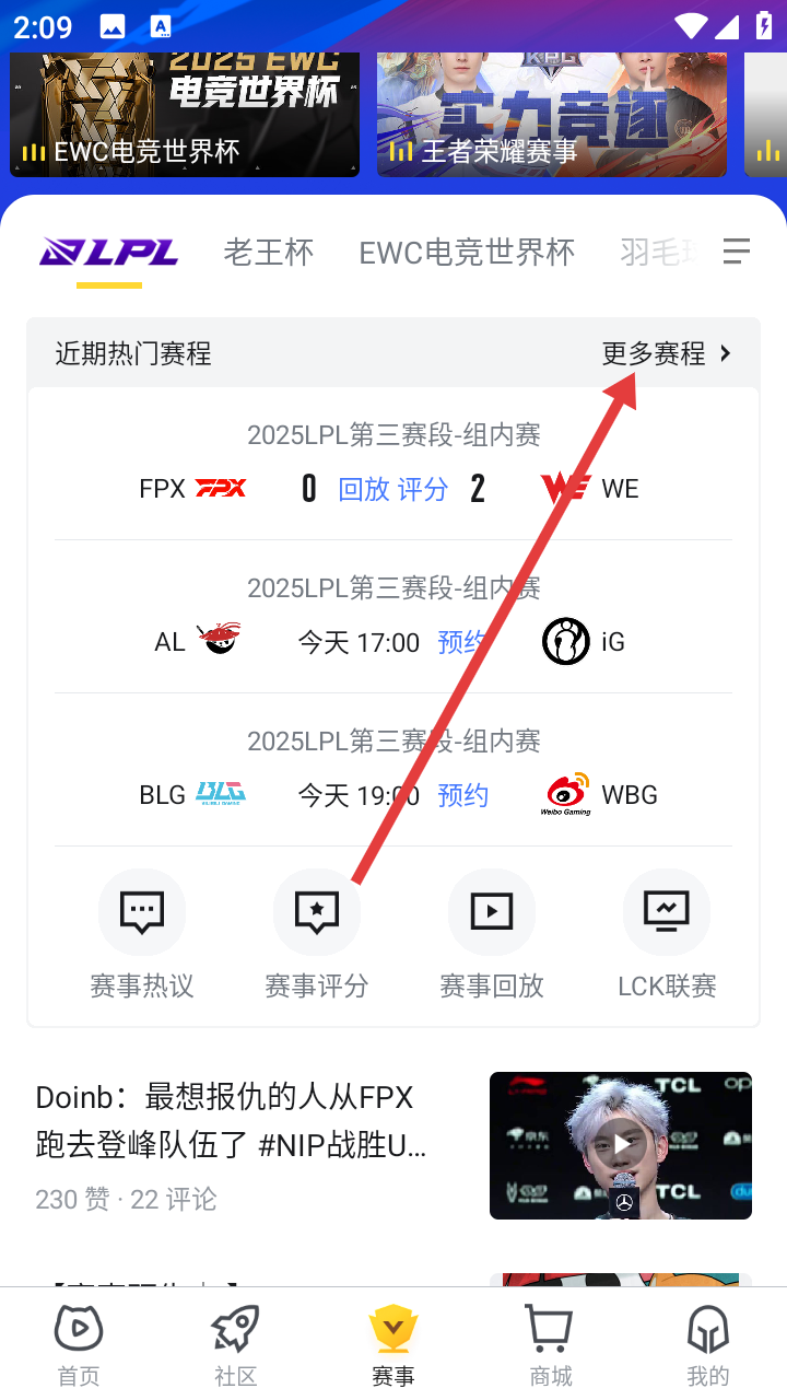 1、在赛事页面,点击近期热门赛程右侧的更多赛程,进入赛程列表页。