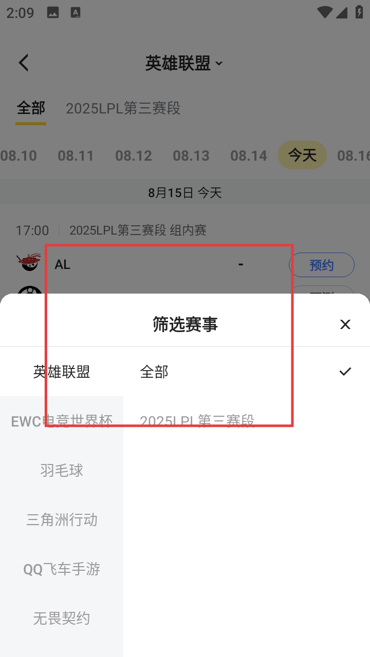 2、在赛程列表,通过筛选赛事功能,选择英雄联盟及具体赛事阶段如2025LPL第三赛段,精准查找想看的比赛。