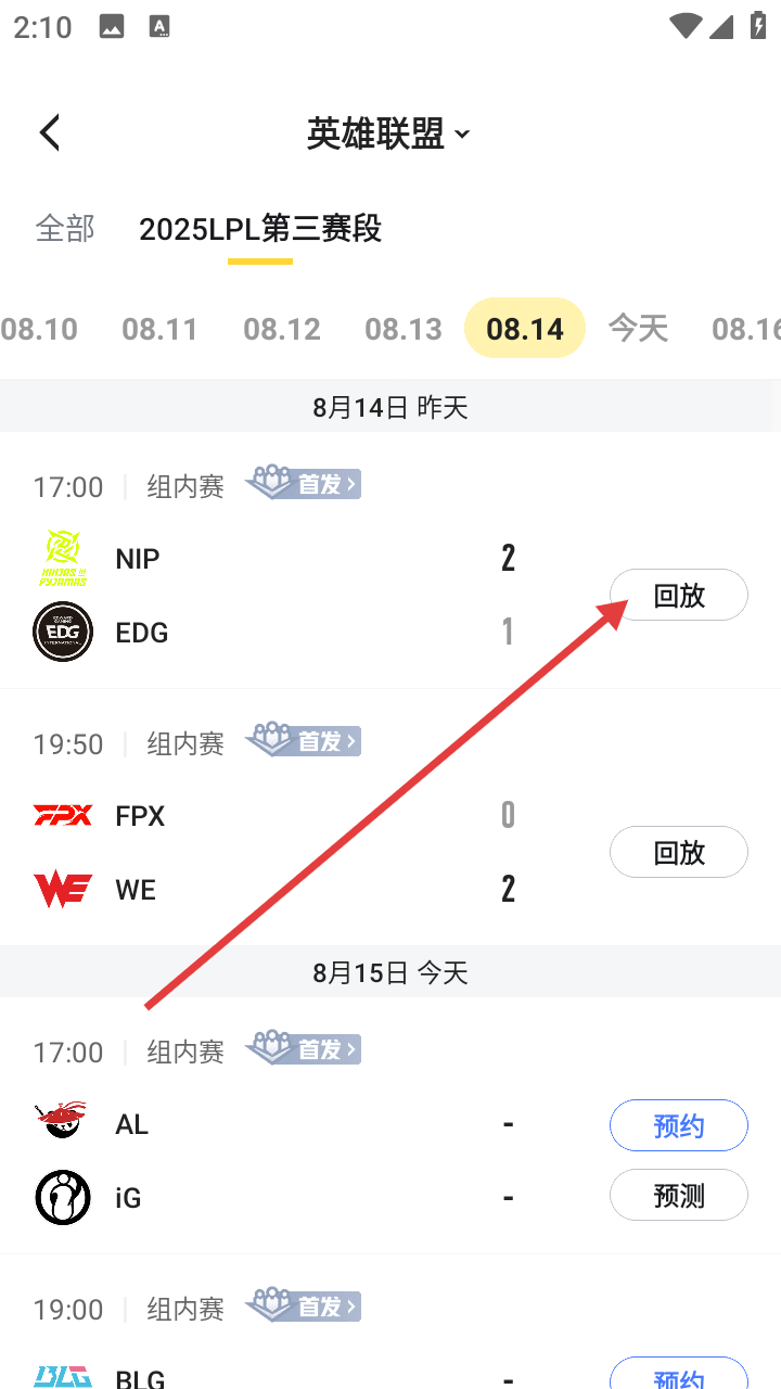3、找到对应赛事如8月14日NIPvsEDG的比赛,点击回放按钮,即可观看赛事回放内容。
