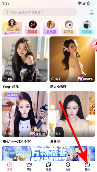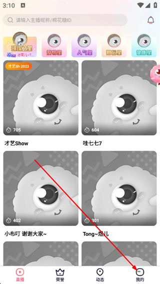 1、打开棉花糖直播APP,点击底部导航栏我的选项。