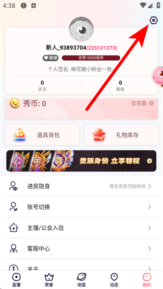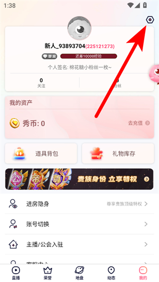 1、打开棉花糖直播APP,点击右下角我的,进入个人页面后点击右上角设置图标。