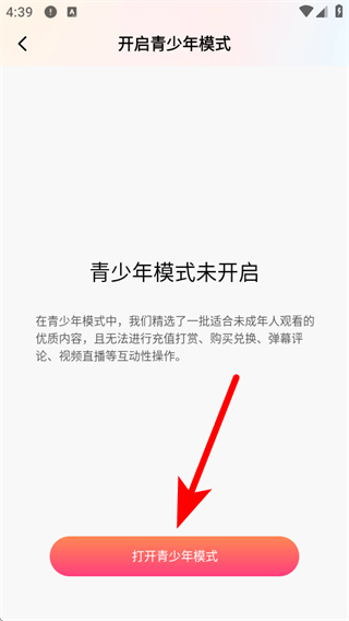 3、在开启青少年模式页面中点击打开青少年模式。