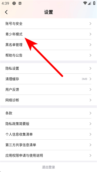 2、在设置页面中找到青少年模式选项并点击,进入开启青少年模式页面。