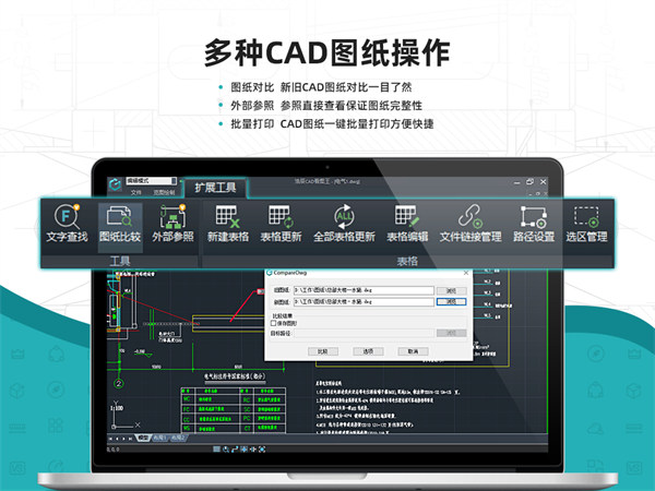 2、软件拥有多种工具插件,可以在用户使用软件时提高帮助,如提供CAD图纸比较、外部参照、表格、批量打印和输出PDF等功能。