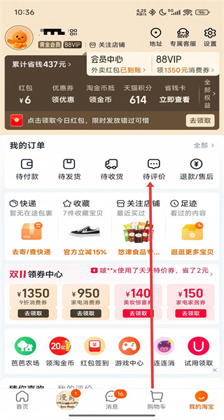 2、登录后进入我的淘宝页面,点击待评价选项,进入评价管理界面。