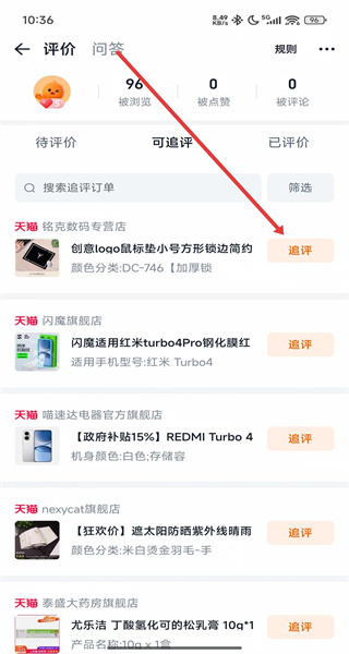 3、在评价管理界面的可追评列表里,找到要追评的商品,点击商品右侧的追评按钮。