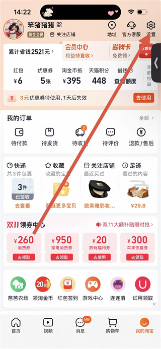 1、在淘宝首页,点击右下角我的淘宝选项,进入个人中心页面。