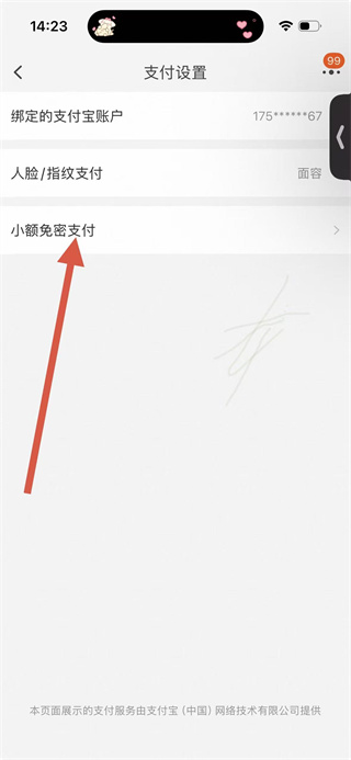 4、在支付设置页面,点击小额免密支付选项,即可打开小额免密支付功能。