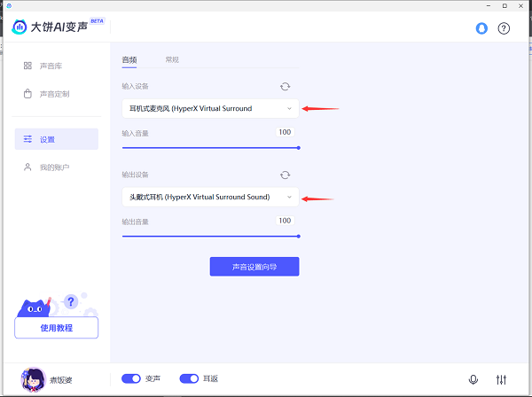 1、在大饼AI变声器中将输入/输出设备设置为耳机扬声器和耳机麦克风;