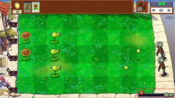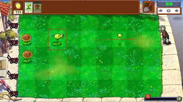 3、看到僵尸出现需要及时的放置豌豆射手进行攻击,及时放置避免被僵尸入侵房间吃掉大脑;