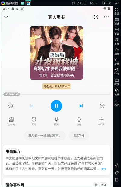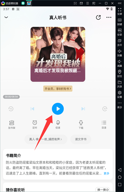 3、进入书籍信息界面后,在中间会有一个三角符号,点击即可开始听书;