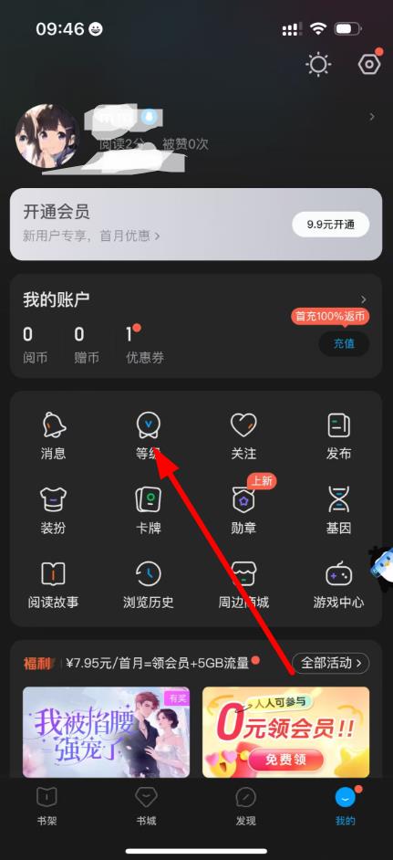 1、打开QQ阅读APP,点击底部“我的”进入个人页面,点击等级选项进入等级界面。