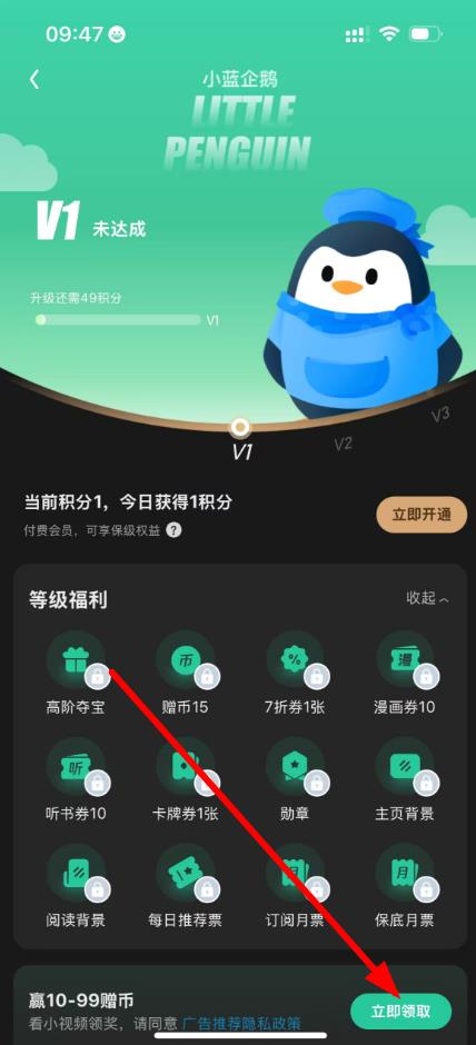 2、在等级界面查看等级福利,找到获取积分相关活动,如点击赢10-99赠币栏的立即领取。
