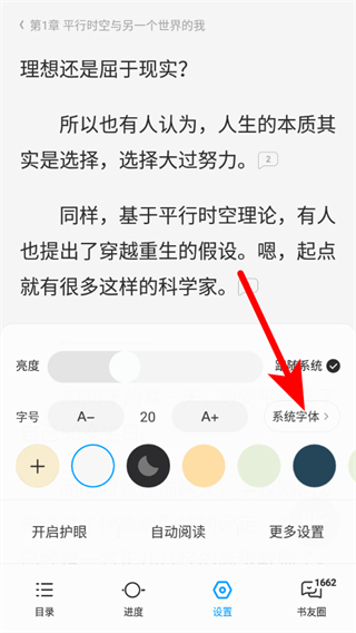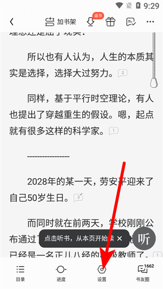 3、在书籍阅读页面,点击设置选项,进入设置页面。