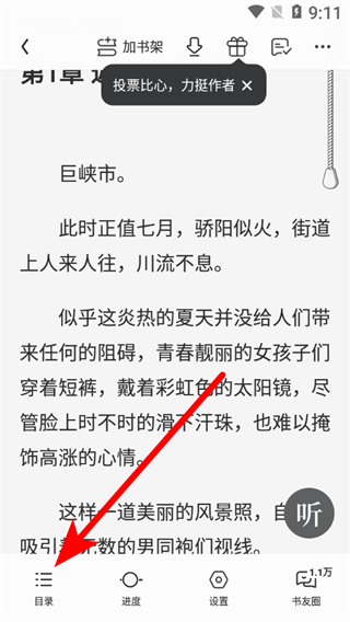 4、开启听书后,上方会有听书进度,用户可以自由调节。