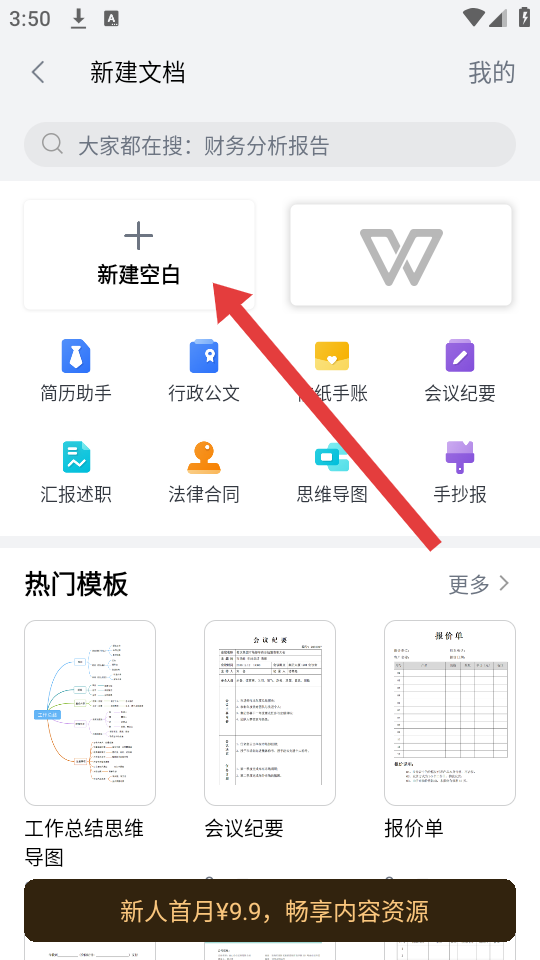 3、在文字文档创建页面,点击空白文档,即可完成创建文档的操作。