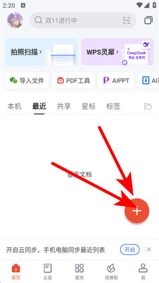 1、打开WPS Office的app软件,在首页右下角找到红色+号按钮,点击该按钮弹出新建功能菜单。
