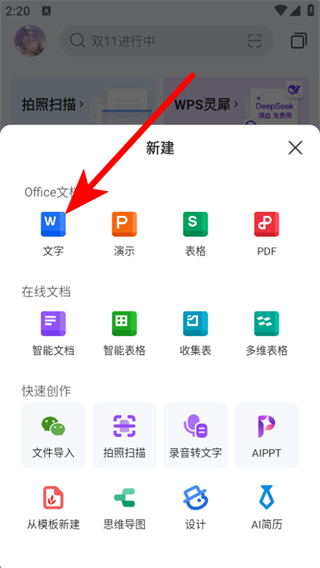 2、在弹出的新建功能菜单中,需要点击Office文档板块下的文字选项,进入新建文档的页面。