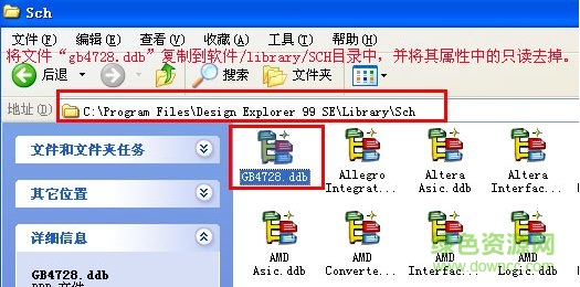 4、再安装国标码库:将文件“gb4728.ddb(国标库)”复制到Design Explorer 99 se/library/SCH目录中,并将其属性中的只读去掉。