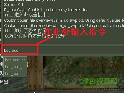 4.在控制台的输入栏处,输入“bot_add_ct”是添加反恐精英;输入“bot_add_t”是添加恐怖分子,输入后点击右下角的“submit”,每输入提交一次可添加一个机器人,玩家根据需要添加电脑人数量吧