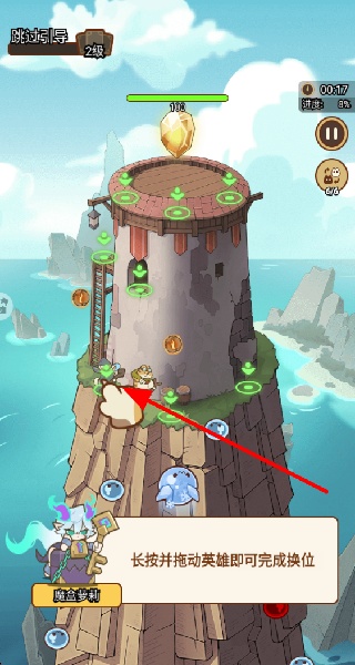 2、长按并拖动英雄完成换位,调整英雄在塔上的位置,优化防守布局,更好地应对敌人进攻。