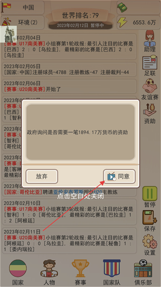 2、面对政府资助询问,点击同意,获取资金支持,助力足协发展。