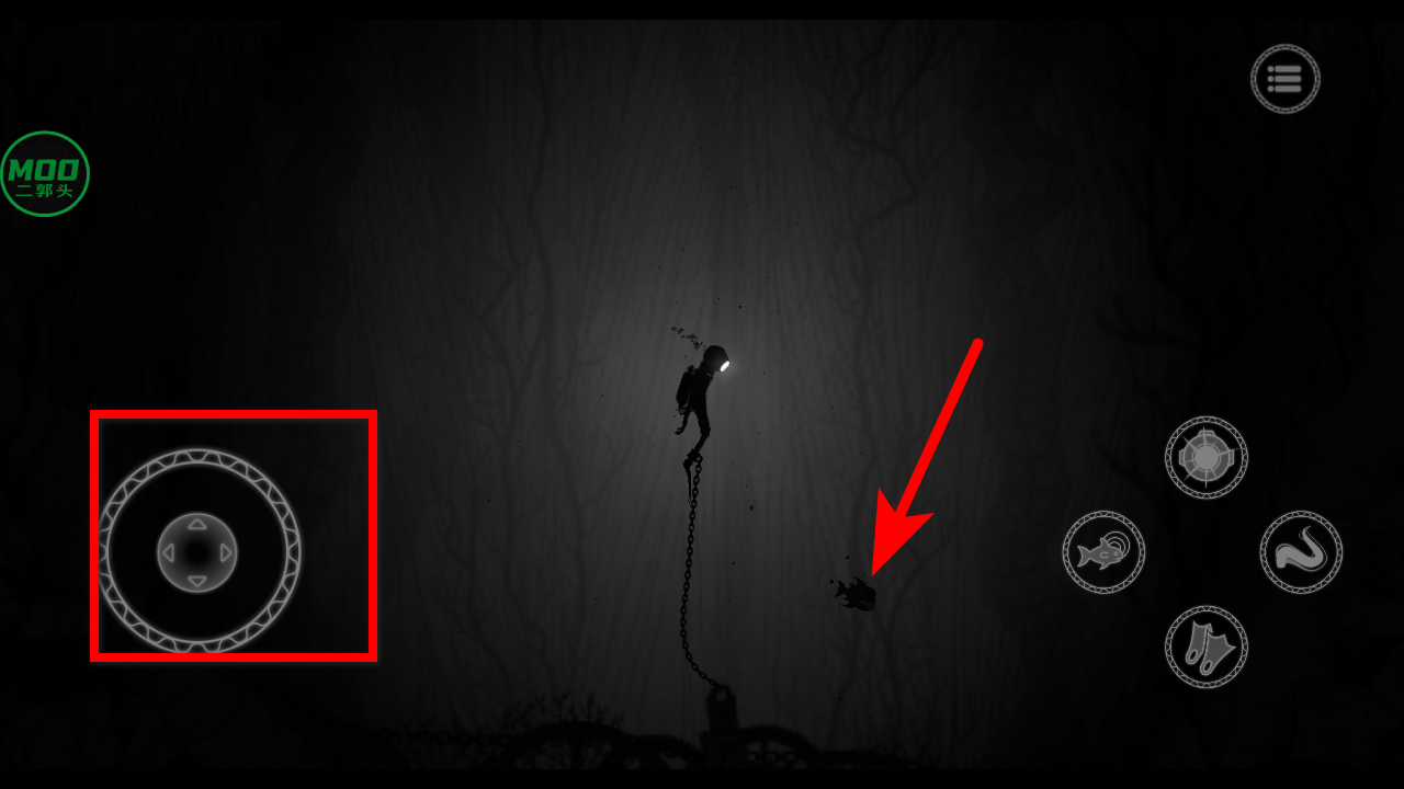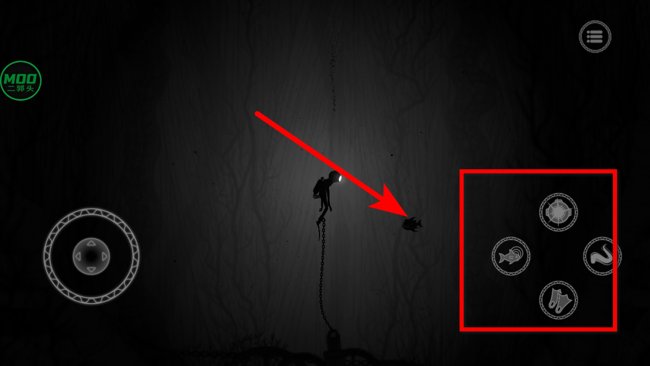 4、结合右侧其他功能按钮如鱼形、脚蹼形等,合理切换能力,探索海底场景,完成游戏任务。