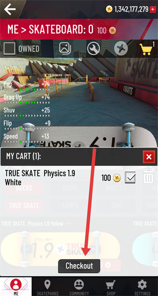 4、购物车页面点击“Checkout”,完成滑板购买操作。