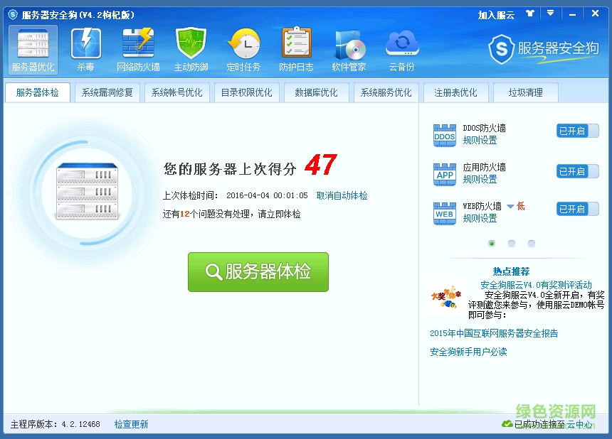 服务器体检、系统漏洞修复、系统帐号优化、目录权限优化、系统服务优化、注册表优化、垃圾清理,服务器安全狗提供最全面,最便捷的的服务器系统优化。