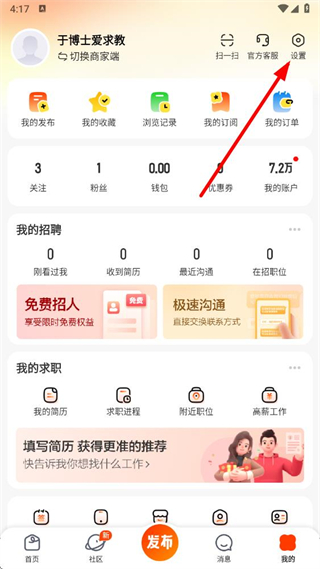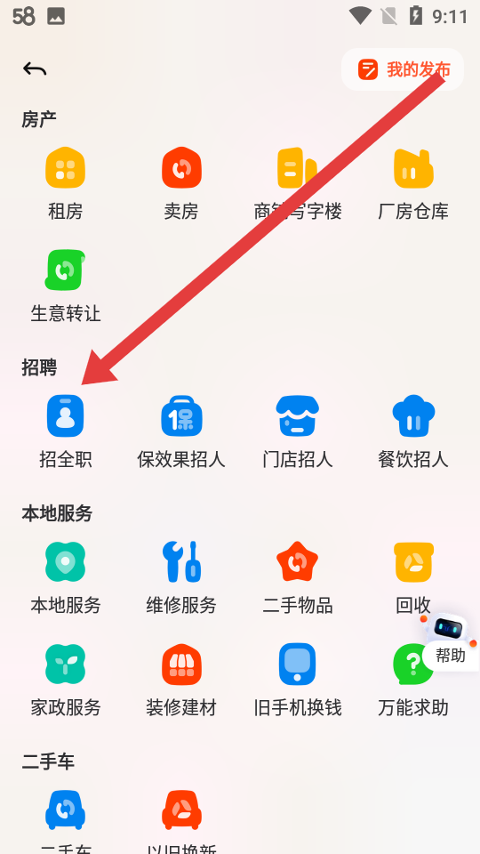 2、在发布分类的页面,找到招聘的板块,点击招全职选项,蓝色人物的图标,进入招聘信息填写页面。