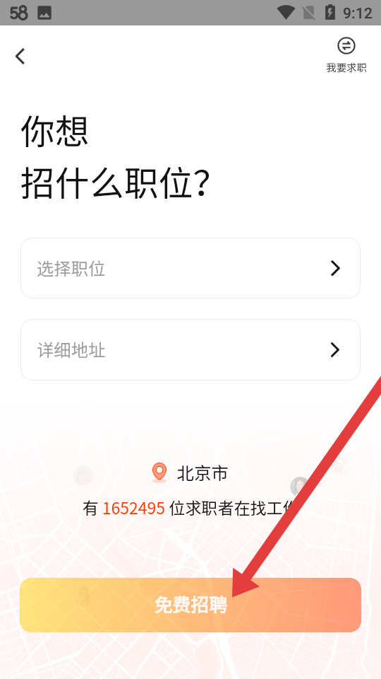3、在你想招什么职位页面,依次填写选择职位、详细地址等信息,确认后点击免费招聘按钮,完成招聘信息发布。