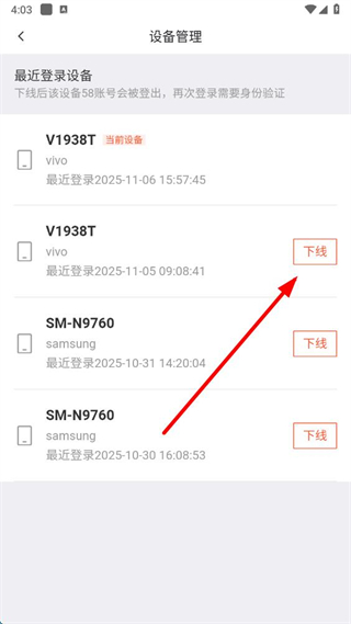 4、在设备管理界面,找到要删除的登录设备,点击其右侧下线按钮即可删除该登录设备。
