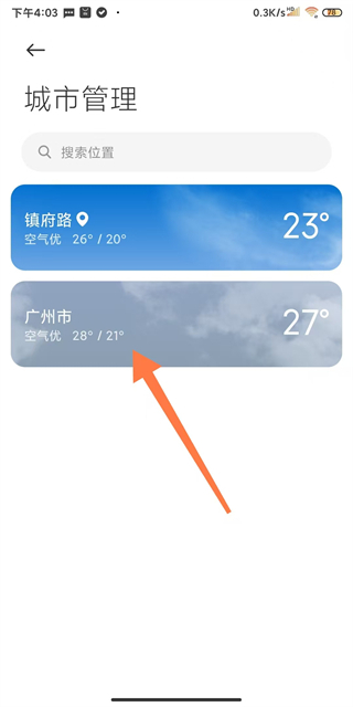 2、进入app后点击界面右上角的定位标识,进入城市管理界面,选择或搜索想要查看天气的城市。