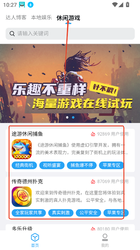 1、进入首页,提供达人博客,休闲游戏,本地娱乐等多个板块