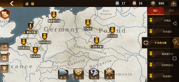 部署集团军部队,每个国家有其专属科技卡牌,通过科技卡牌加速征服世界的进程。