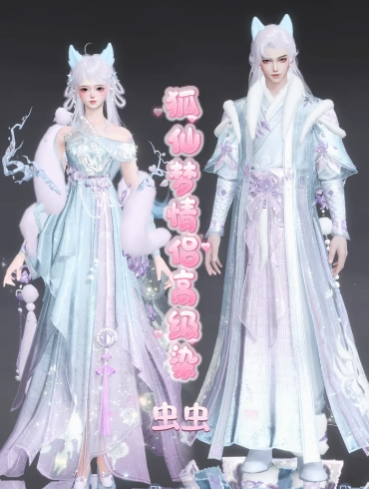 冰蓝叠浅紫的渐变在布料上晕染出晨雾烟岚的层次,毛绒狐耳灵俏鲜活,露肩设计衬得娇俏万分,恰似从秘境溜出来的灵狐!男款宽袍舒展,冰蓝底晕着浅紫暗纹,狐耳支棱却满是仙门风骨,妥妥画里走出来的狐仙仙君,帅得菌菌心巴狂跳~