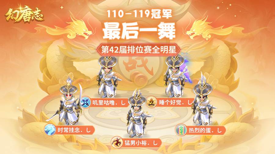 幻唐志第42届排位赛全明星各个分组的赛事已经圆满落下帷幕,首先让我们恭喜“最后一舞”队一举摘下42届110-119级分组的桂冠!